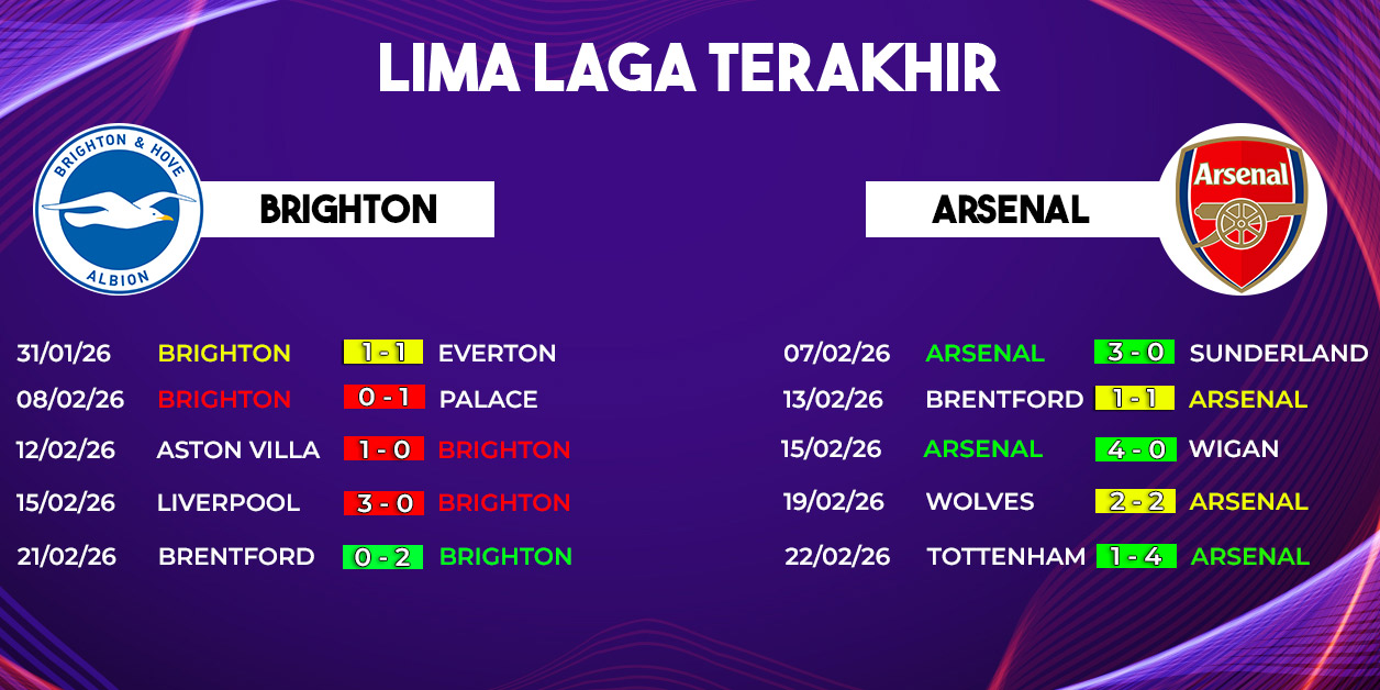 Berikut data 5 pertemuan terakhir Brighton vs Arsenal yang menunjukkan dominasi dan dinamika pertandingan kedua tim: